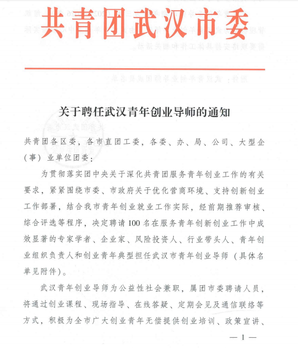 武汉青年创业导师团是团市委为帮助创业青年解决实际困难,进一步面向基层、下沉资源,实现服务青年创业工作重点、资源和方式的转变,为创业青年提供导师服务的团队。经前期推荐审核、综合评选,共青团武汉市委决定聘请100名在服务青年创新创业工作中成效显著的专家学者、企业家、风险投资人、行业带头人、创业青年典型担任武汉市青年创业导师。