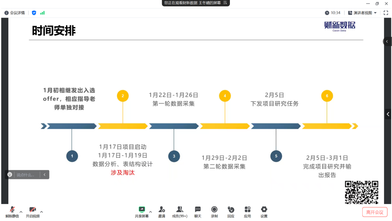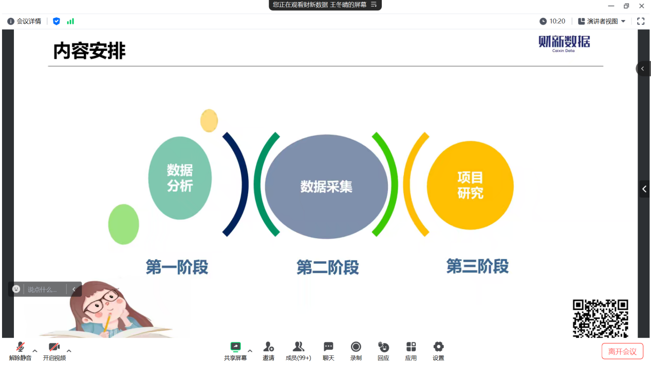 在会议开始,王冬晴对财新数据公司以及项目实习项目安排做了简单介绍,而后以提问的形式引出员工对于数据分析的理解,并以宏观经济数据为例,以现成数据库怎么做?数据源怎么找?优先采集哪个数据库?选用哪种频率的数据?采集手段选用人工还是AI?五连问的形式突显出了数据分析的复杂与神奇。