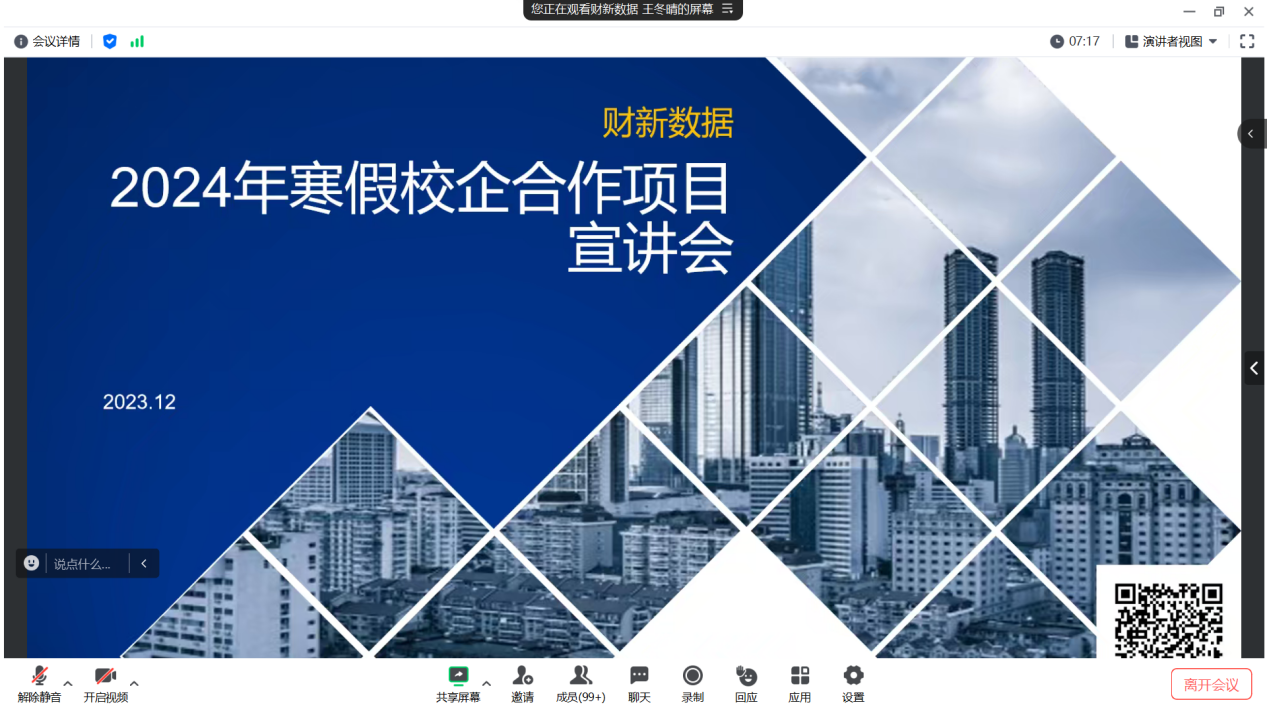 在成功举办暑期实践项目的基础上,经济学院与财新数据公司再度携手,于2023年12月28日,通过腾讯会议平台,成功启动了寒假校企合作实践项目——“ESG专题”宣讲会。本次宣讲会由财新数据公司数据分析部的王冬晴老师担任主讲人,吸引了经济学院2022级和2021级共计150余名员工踊跃报名参加。此次实践项目旨在深化员工对ESG领域的理解与实践能力,为未来的职业发展奠定坚实基础。
