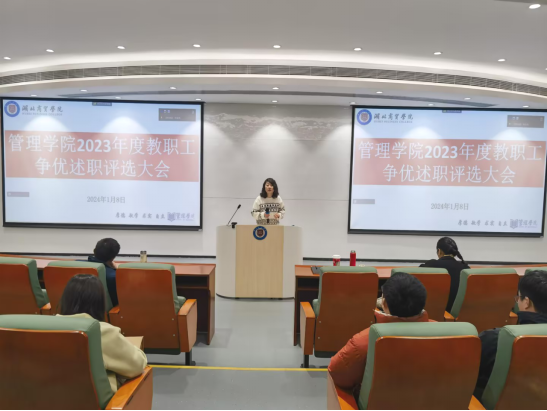 2023年1月8日上午9点,管理学院在鸿博楼J1教室举行“我为商贸做贡献”2023年度教职工争优述职大会,学院领导班子和全体教职工全程参与此次述职大会,咸宁校区同步线上参会,会议由党总支书记王珉主持。