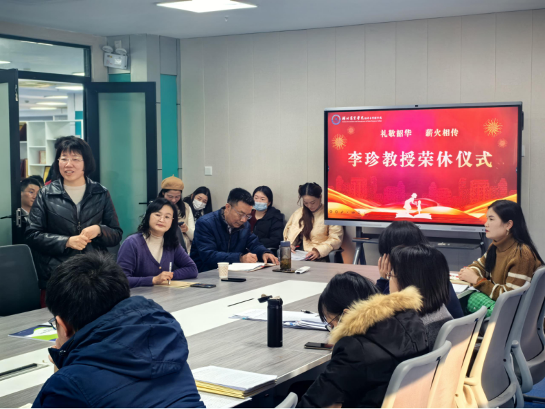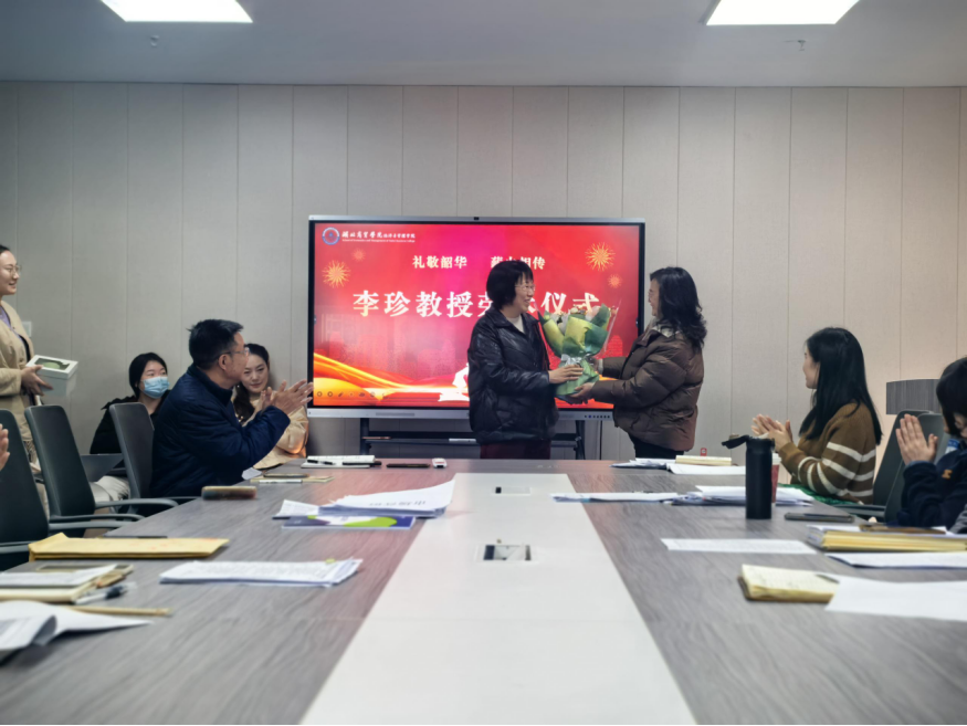 副董事长胡柳高度评价李珍为学校的教学事业做出的突出贡献。她指出,李珍不仅是学院的骄傲,更是学校的荣耀。她是我们的榜样,我们要传承她的榜样力量及精神财富。希望学院全体教师能够继续发扬李珍的优良传统,为经管学科的发展贡献自己的力量。